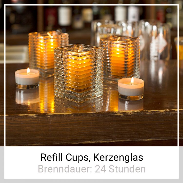Mit unseren 24h Refill-Cups und den passenden Kerzengläsern setzen Sie auf eine dauerhafte Lösung für ein stimmungsvolles Ambiente. Die Cups werden nach der Brenndauer von 24 Stunden einfach ausgetauscht – Glas und Tisch bleiben sauber. Für mehr Abwechslung gibt es die Refill-Cups in zehn verschiedenen Farben.