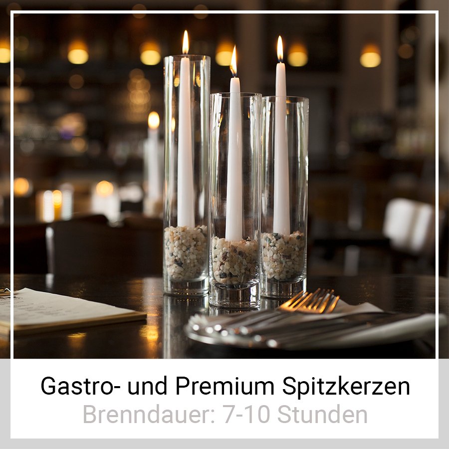 Unsere Spitzkerzen bieten wir Ihnen sowohl als Gastro-Kerze mit einer Länge von 24 cm, als auch in einer Premium Version mit einer Länge von 28 cm an. Unsere Gastro-Spitzkerzen punkten mit einer Brenndauer von sieben Stunden und einer Farbauswahl von acht Farben, die Premiumkerzen werden im Tauchverfahren hergestellt, sind in 18 Farben erhältlich und haben eine Brenndauer von zehn Stunden.